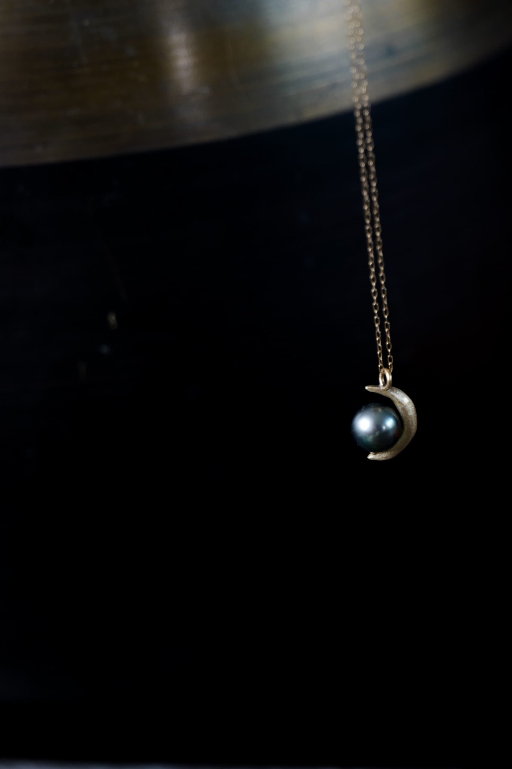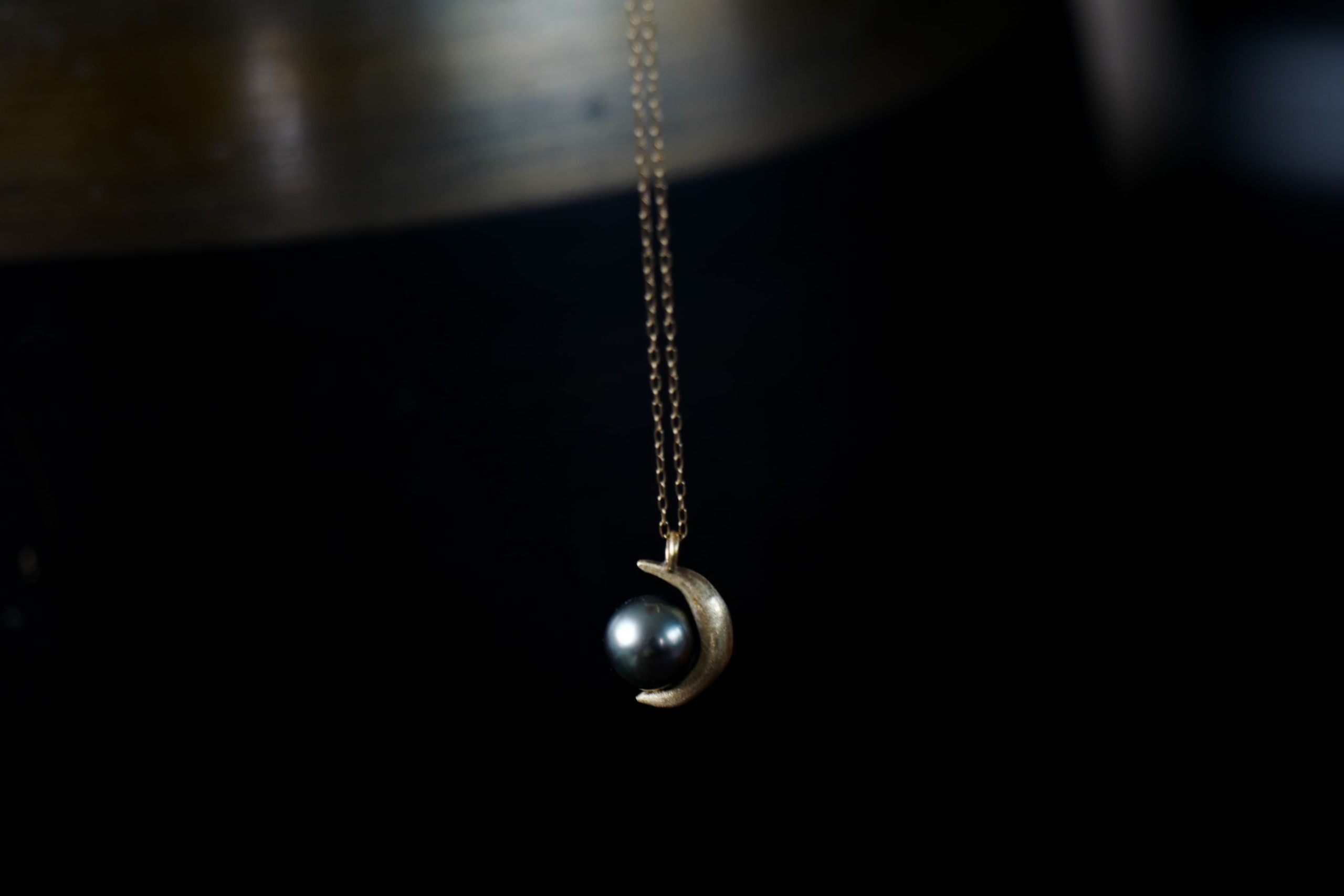 A pendant shaped like a crescent moon gently holding a small pearl —
